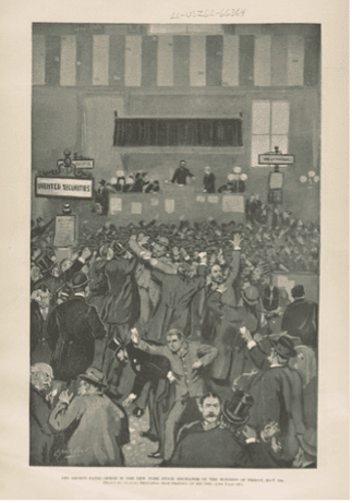 Broughton, Charles. „Scena recentă de panică de la Bursa de Valori din New York în dimineața zilei de vineri, 5 mai.” 1893. Fotografie. Biblioteca Congresului, Washington, DC